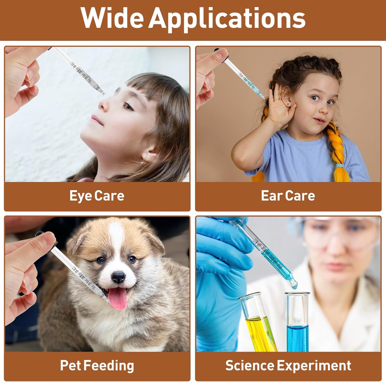 Wide Applications: Our eye dropper is great for measuring and transferring a wide variety of liquids and are great for beauty care, eye care, ear care, pet feeding, science experiments, arts and crafts